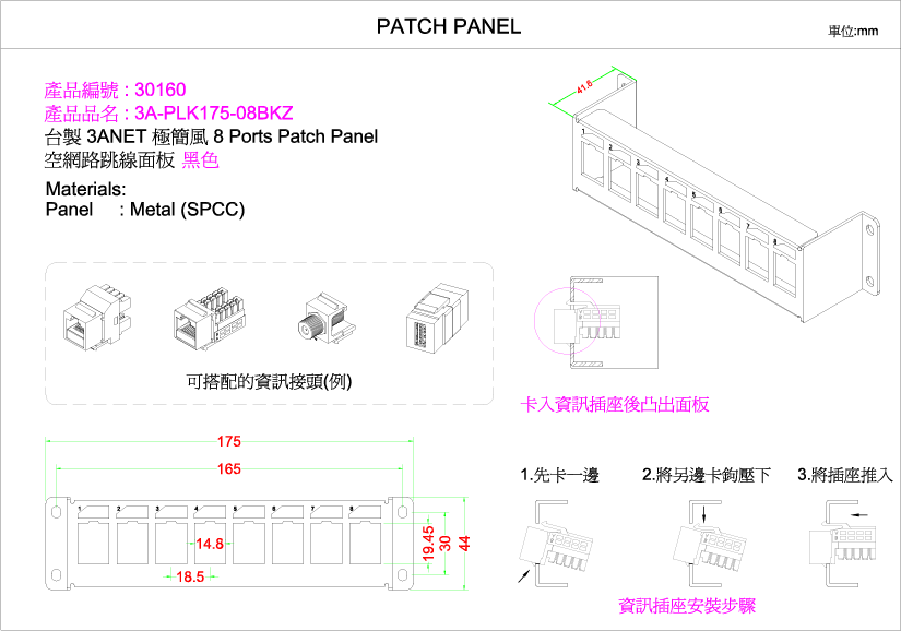 【3ANET】台製 ●極簡風 ●8 Ports ●Patch Panel ●空網路跳線面板